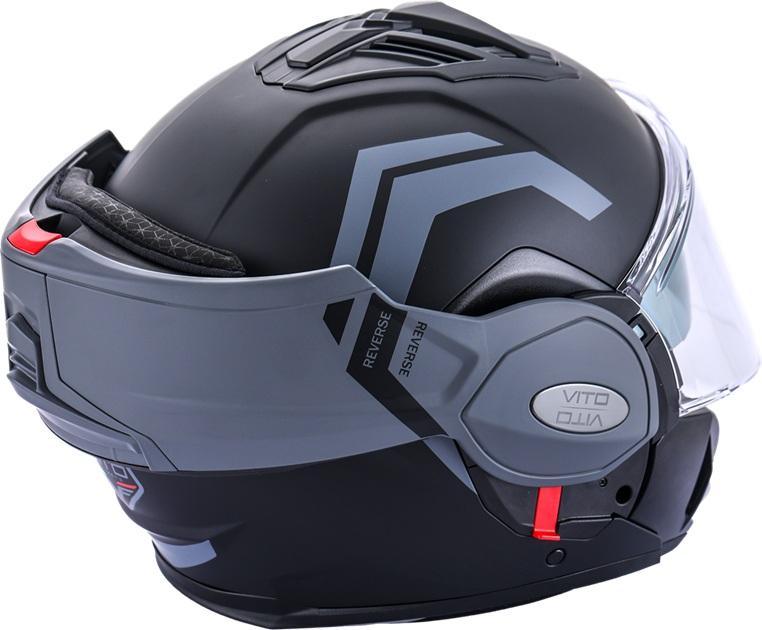 De Vito Reverse is een moderne systeemhelm in mat zwart/grijs met een comfortabele pasvorm en complete uitrusting. Dankzij de thermoplastische schaal, het gewicht van ca. 1780 gram en de uitneembare, uitwasbare binnenvoering is deze helm ideaal voor dagelijks scooter- en motorgebruik.